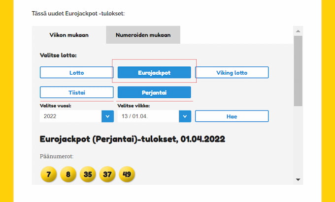 Yllä olevasta työkalusta käy helposti ilmi uusin Eurojackpot tulos sekä aikaisempien kierrosten tulokset. Voit katsoa historiadataa tai sitten tarkastaa osuivatko numerot valitsemalla ”Numeroiden mukaan”.